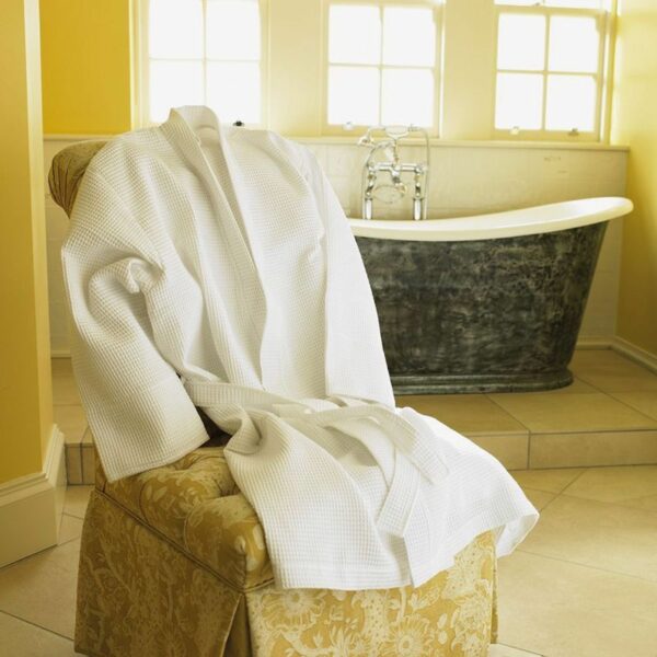 Traditional, soft, textured waffle robe with deep patch pockets and kimono styling.
